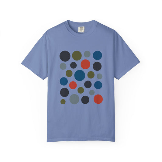 • Abstract Circle Design in Modern Muted Tones T-Shirt featuring non-repetitive solid circles, offering a stylish, artistic vibe. Ideal for casual or semi-formal wear, embodying FireBrook Essentials' comfort and positivity-focused ethos.