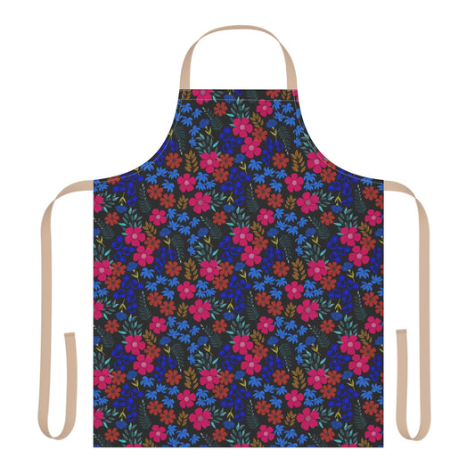 • Apron Floral Design: A vibrant kitchen apron with a dense floral pattern in pink, red, blue, and mustard-yellow, featuring solid-white neck and waist ties, crafted for comfort and style.
