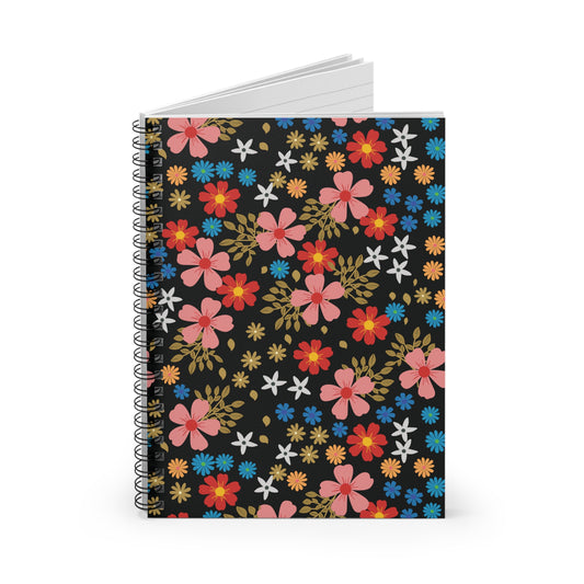 • Floral Spiral Notebook with vibrant clusters of small flowers and green leaves on a black cover, featuring sleek metal spiral binding for easy page turning, ideal for creative and organized note-taking.