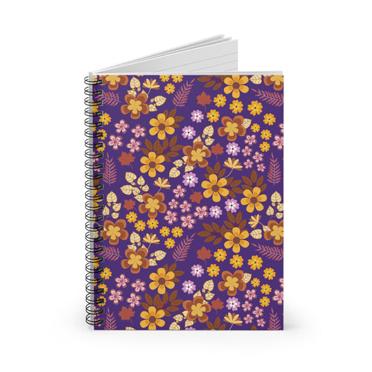 • Floral Spiral Notebook with vibrant warm-toned flowers on a deep purple cover. Ideal for creative note-taking, it features durable metal binding and smooth pages, embodying FireBrook Designs' uplifting style.