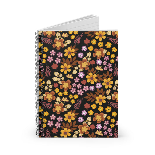 • Floral Spiral Notebook with vibrant autumnal floral patterns on a black cover, featuring sleek metal binding for easy page turning. Ideal for creative note-taking and journaling, enhancing your daily tasks with style.