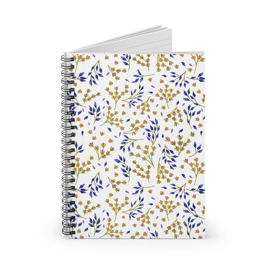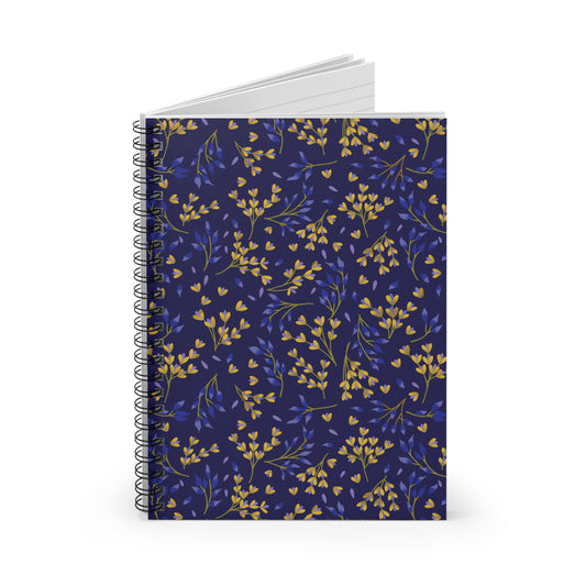• Floral Spiral Notebook with a dark navy cover featuring golden yellow and blue leafy sprigs, bound by sleek metal spirals on the left, ideal for students and creatives alike.