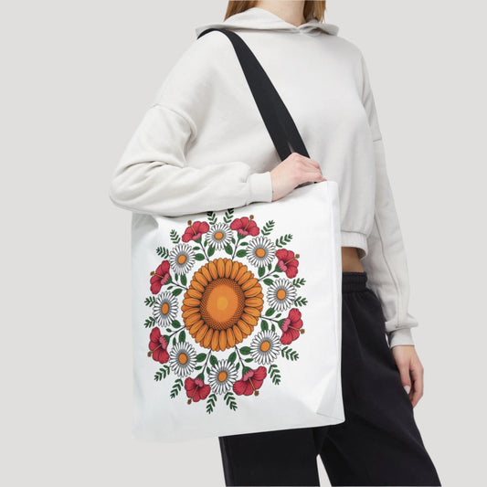 Mandala Design with Sunflowers, Daisies, and Hibiscus Tote Bag