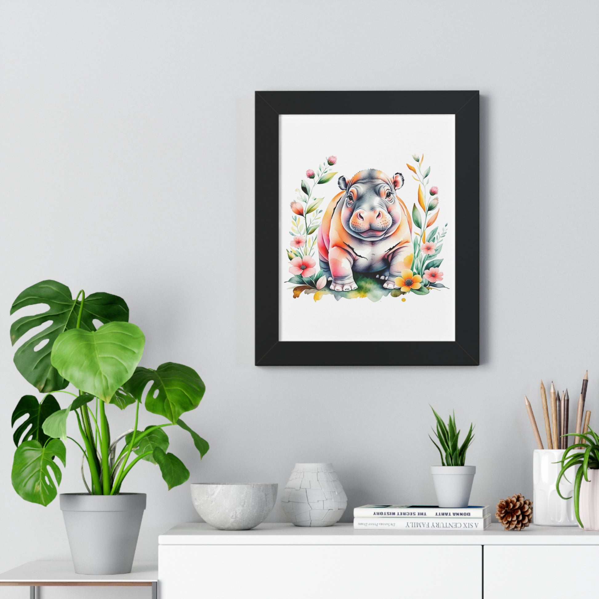 A whimsical baby hippo framed vertical poster, perfect for adding a touch of cuteness to any room. This poster is ideal for nursery decor, baby showers, and children's birthdays.