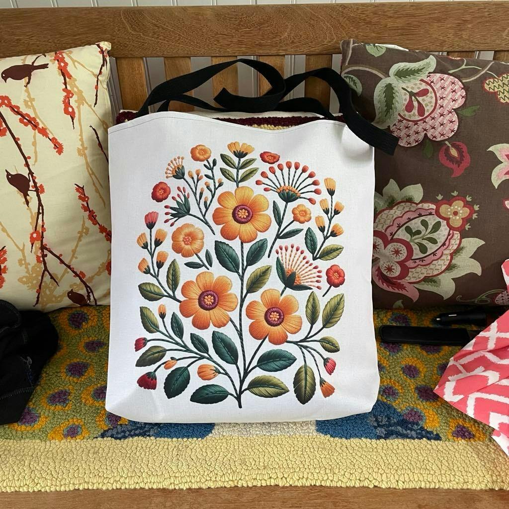 Folk Art Floral Faux Embroidery Style Tote Bag